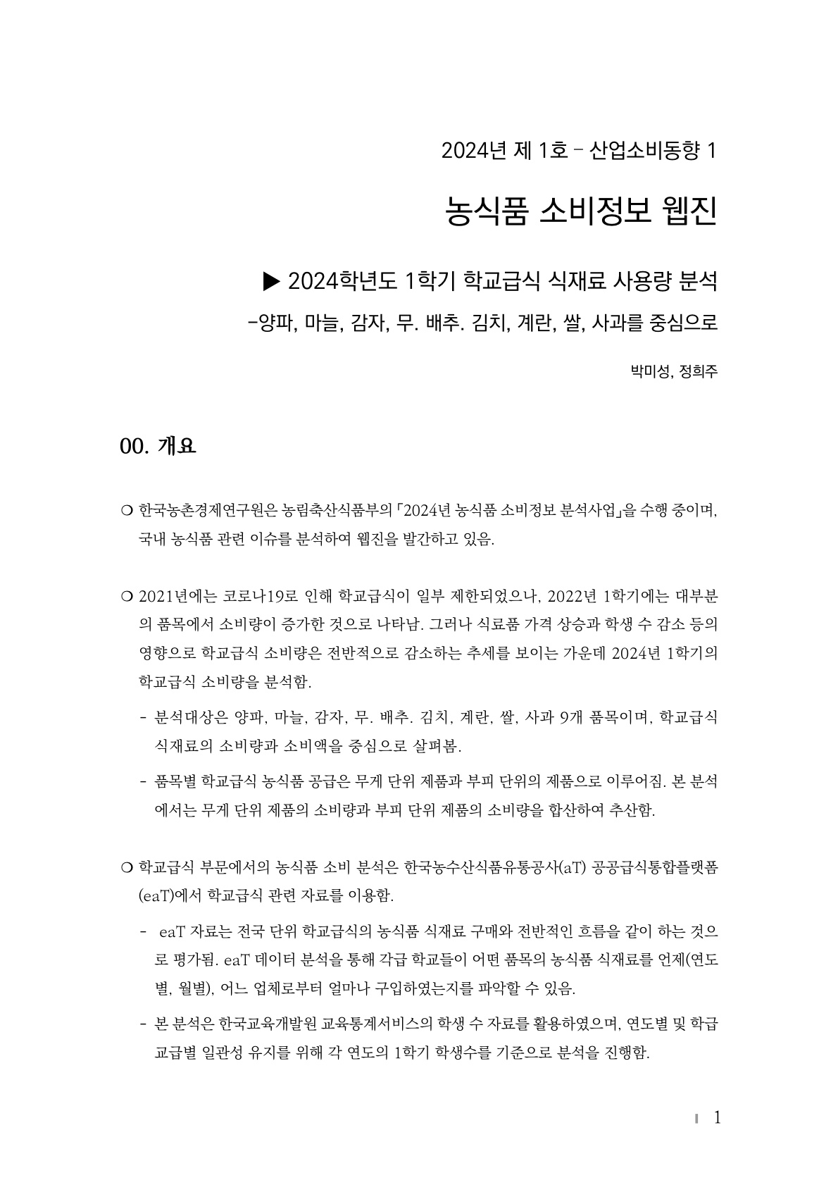 2024년 제2호-산업 소비동향 1. 2024학년도 1학기 학교급식 식재료 사용량 분석
