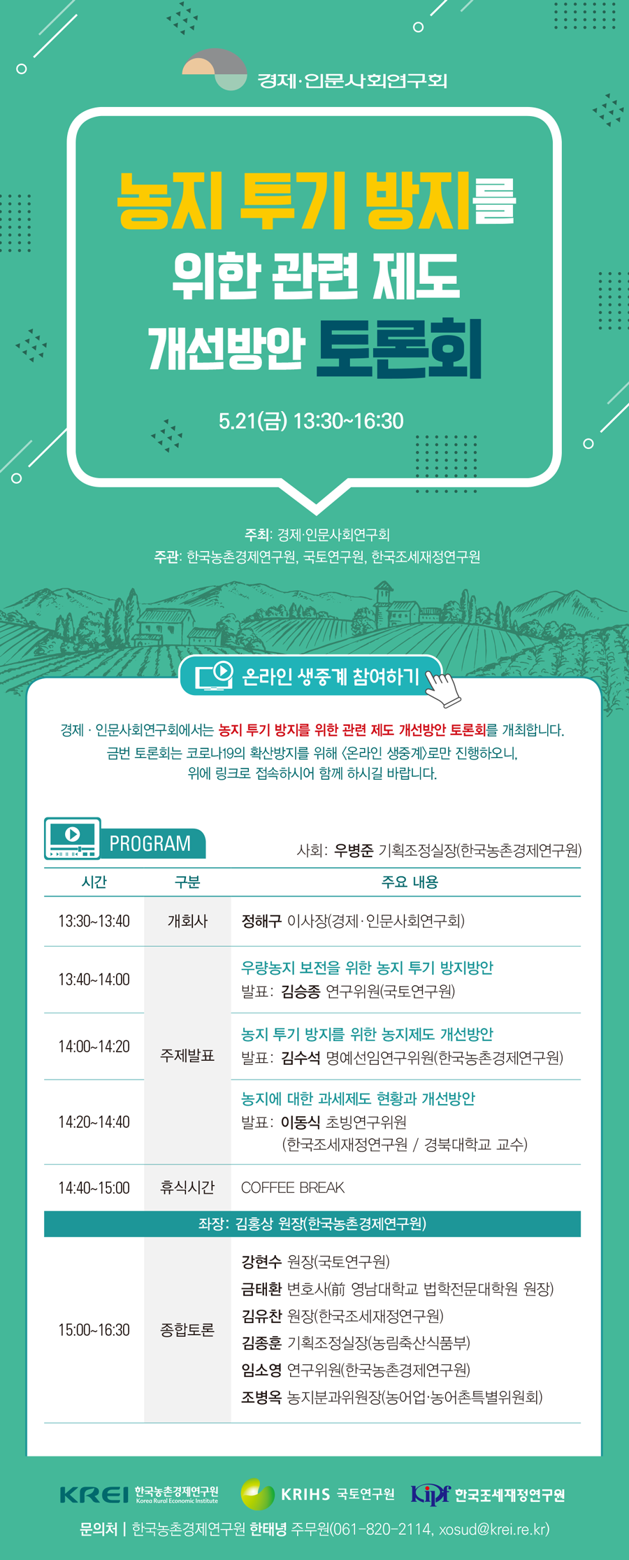 농지 투기 방지를 위한 관련 제도 개선방안 토론회 안내