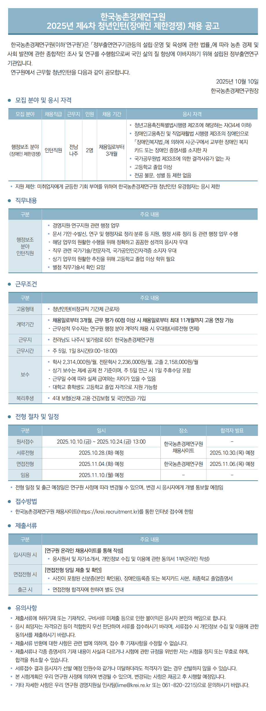 한국농촌경제연구원 2025년 제4차 청년인턴(장애인 제한경쟁) 채용 공고