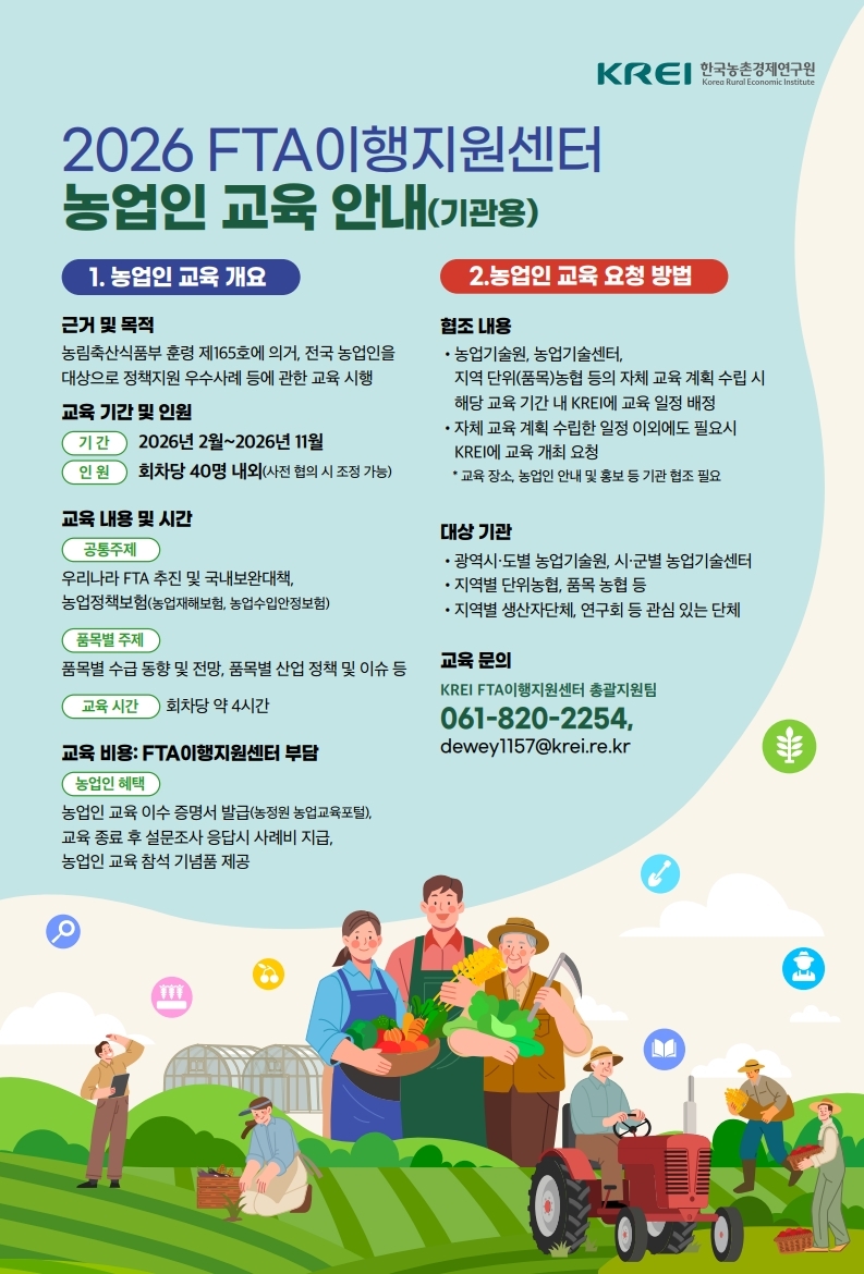 위 사업과 관련해 우리 센터에서는 매년 FTA 농업인 교육을 시행하고 있사오니, 귀 기관에서 수립하거나 수립 예정 중인 2026년 농업인 교육 계획과 연계하여 첨부와 같이 FTA이행지원센터 주관 농업인 교육을 시행할 수 있도록 협조하여 주시기 바랍니다.