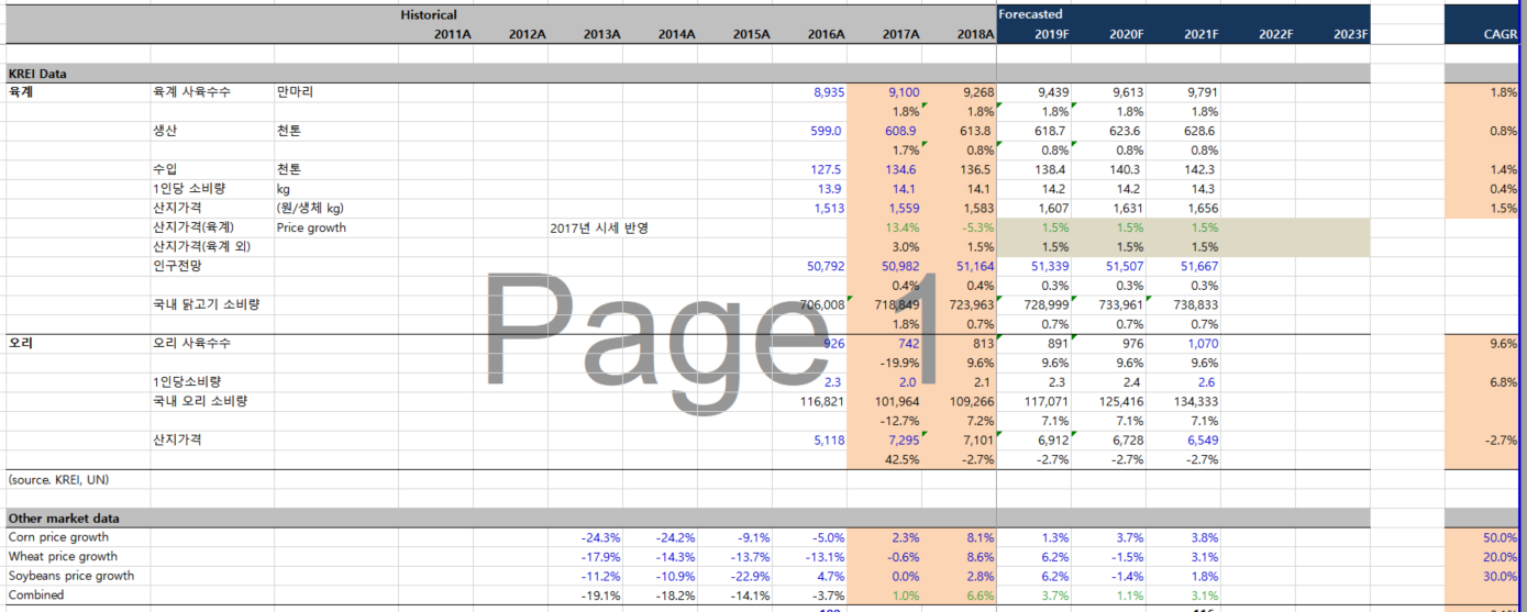 첨부 사진 보시면 예전 (2년전?)에 육계, 오리 등등 생산, 수입, 1인당 소비량, 산지가격 등등을 이전 직원 분께서 업데이트 해 두신거 같은데, Data Source가 KREI라고만 되어 있고 찾을 수가 없네요 ㅎㅎㅎ