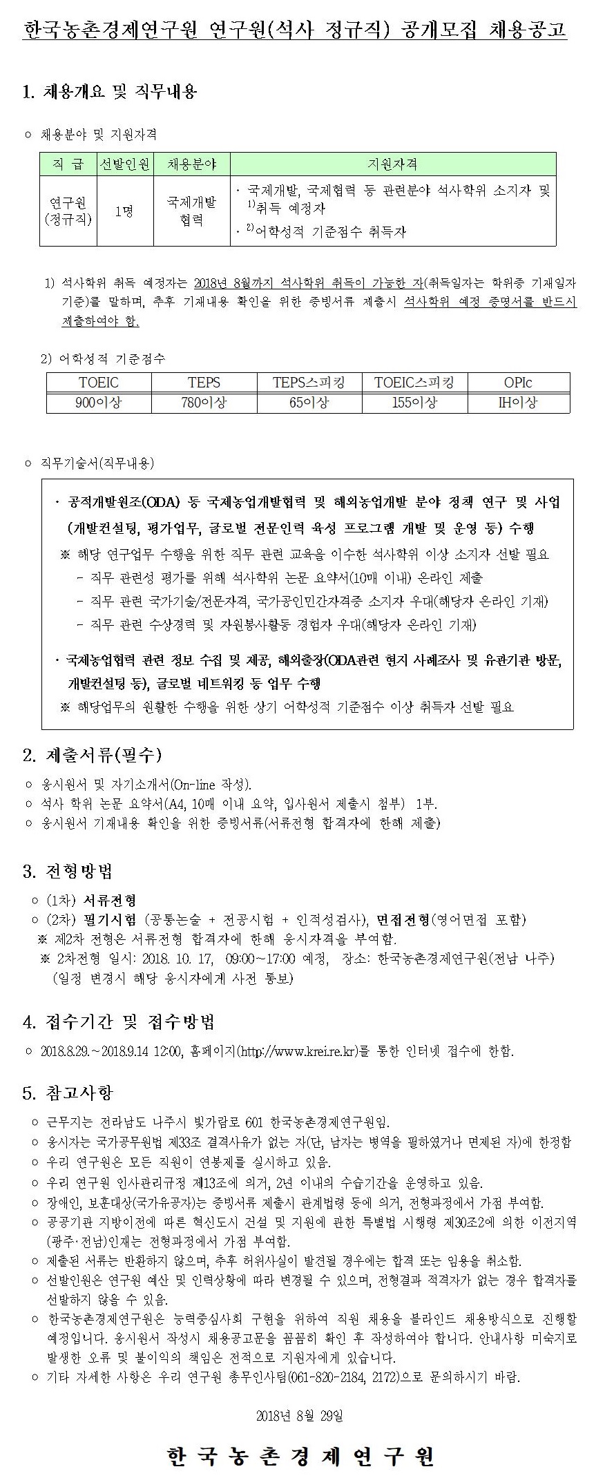 - 한국농촌경제연구원(통상·동북아 연구) 계약직 채용 공고