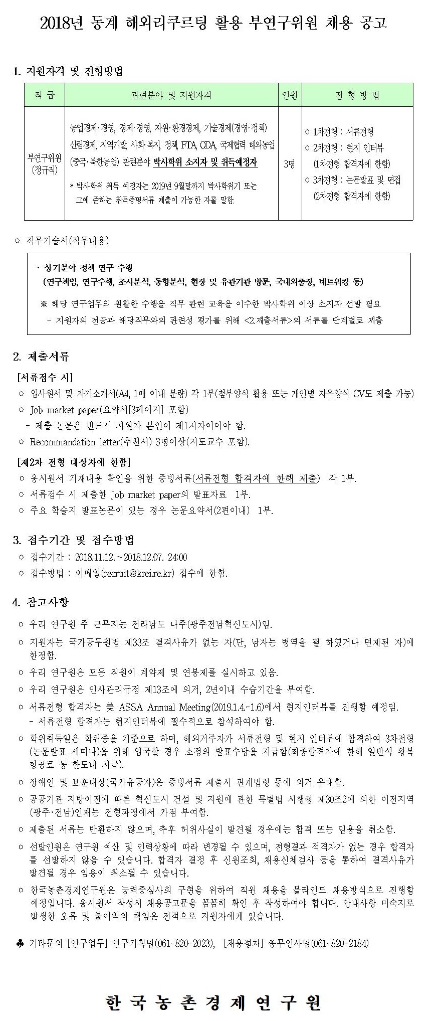 2018년 동계 해외리쿠르팅 활용 부연구위원 채용 공고