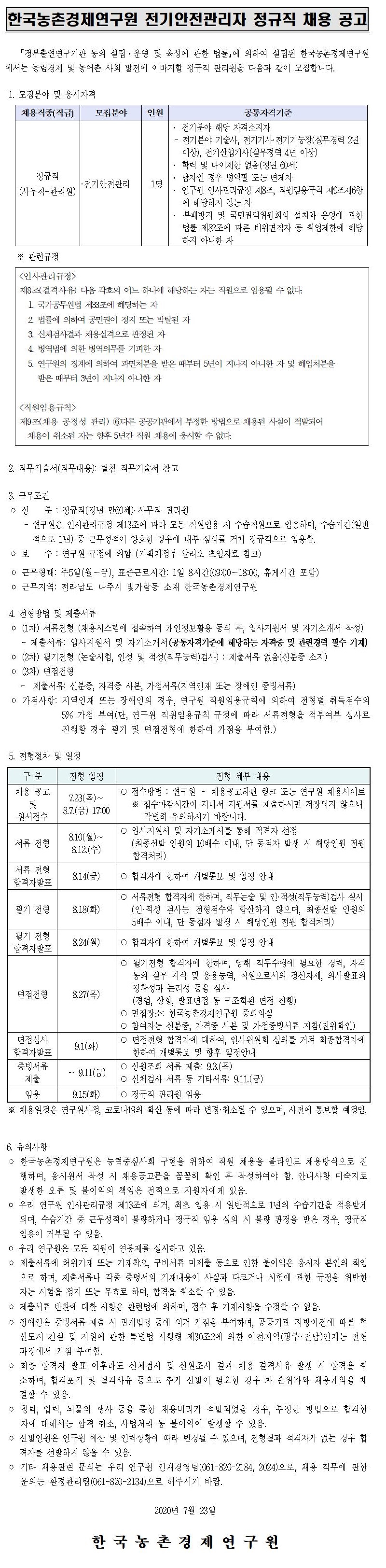 한국농촌경제연구원 전기안전관리자 정규직 채용 공고