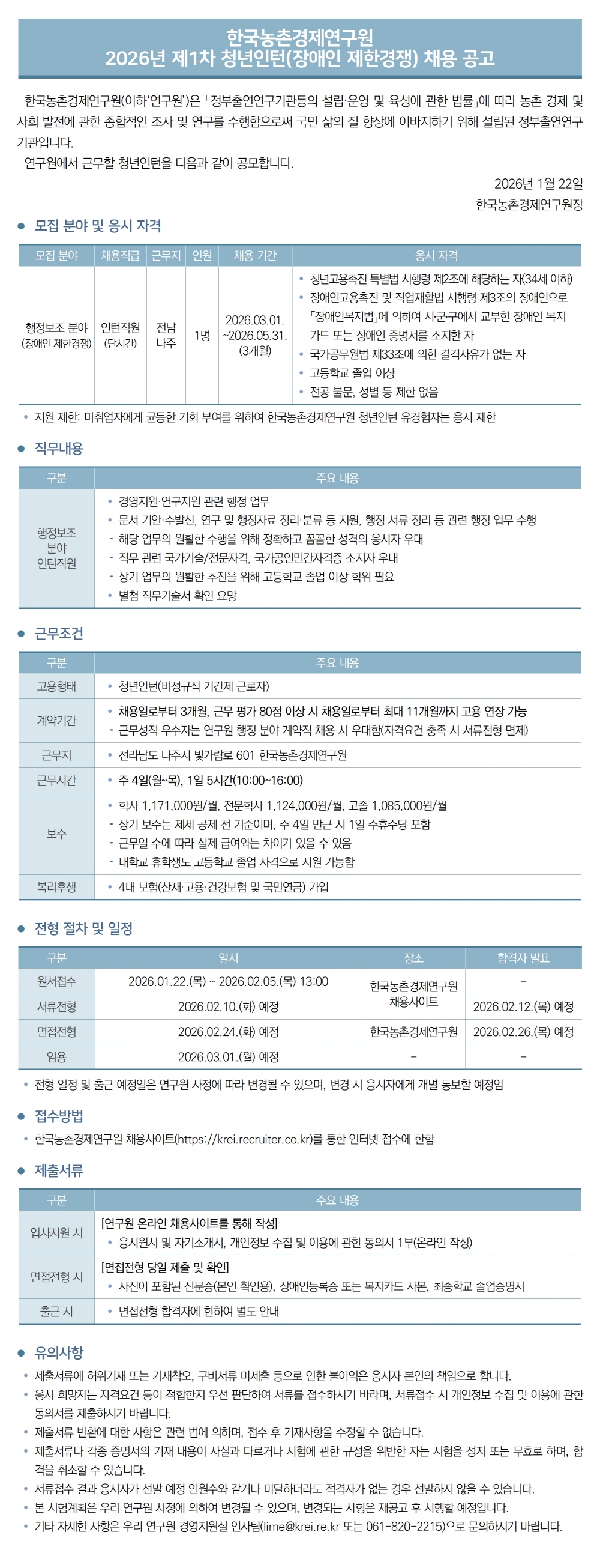한국농촌경제연구원 2026년 제1차 청년인턴(장애인 제한경쟁) 채용 공고